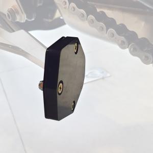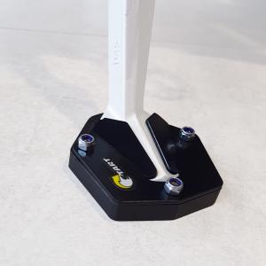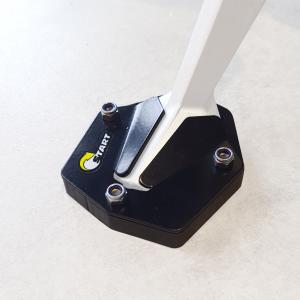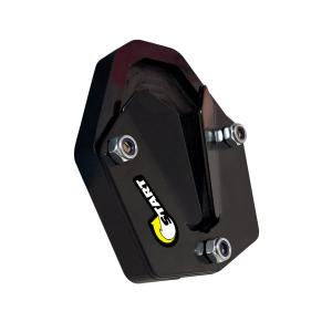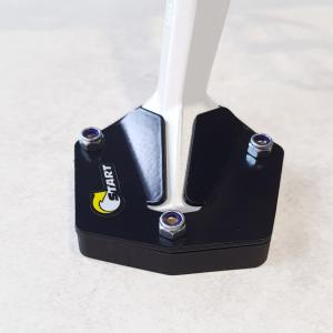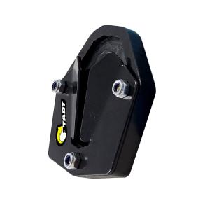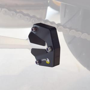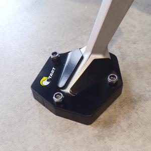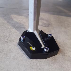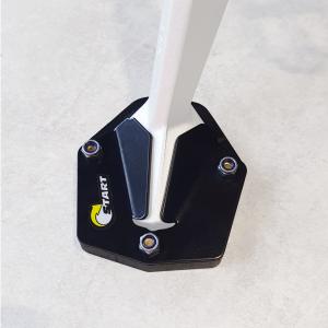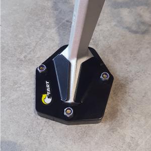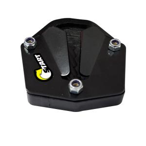 A ampliação de base aumenta a área de contato entre o solo e o Cavalete lateral, evitando assim seu afundamento em terrenos mais macios. Por ser plástico, também evita o aparecimento de riscos no chão.