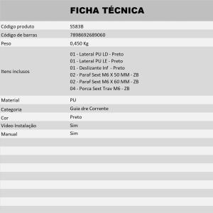 Fabricado em PU de alta resistência, específico para aguentar impactos e abrasão da corrente. Possui refil substituível (Ref. Start S583RB) para troca apenas do refil deslizante da corrente, se tornando um ótimo custo benefício.