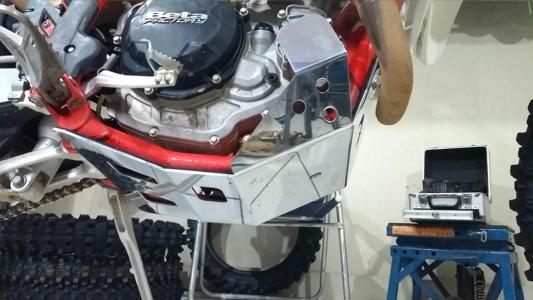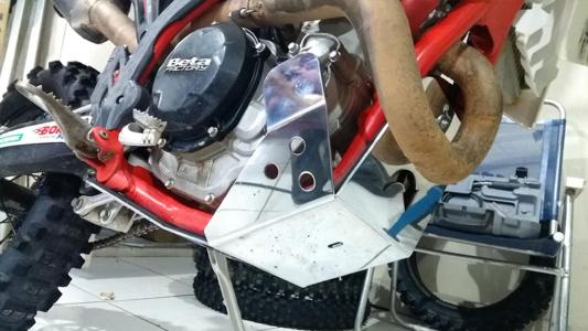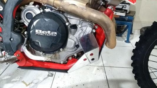 Fabricado em alumínio naval 3mm, com ênfase em proteger o quadro na parte inferior frontal, a bomba da água e a tampa do magneto.