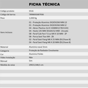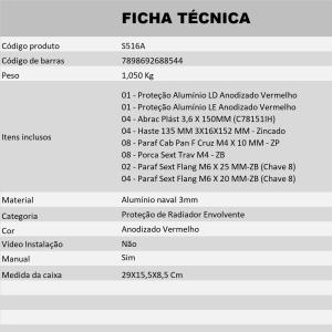 Fabricado em chapa de alumínio naval 3mm e com acabamentos em alumínio polido. Sendo assim serve como primeira barreira para quaisquer tipo de queda e devido ao seu modelo, esta proteção afasta muito pouco o radiador do chassi, desta maneira abre o mínimo as aletas e como é ligada na parte de trás através de mais duas hastes de reforço na parte frontal do radiador, fica muito resistente.