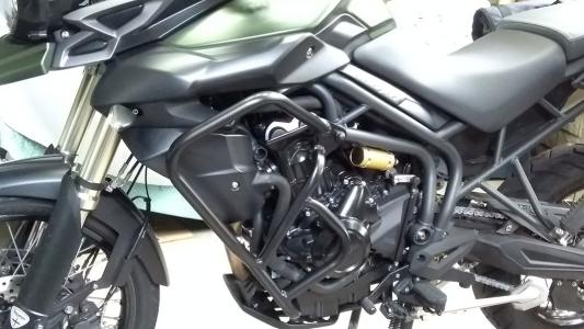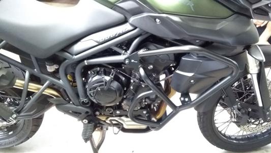 Estrutura tubular e fixadores em aço carbono de alta resistência e acabamento em preto fosco epóxi. Serve como primeira barreira contra impactos aos componentes do motor e laterais do tanque, além de complementar o visual de sua moto.
