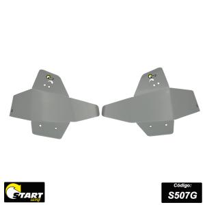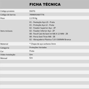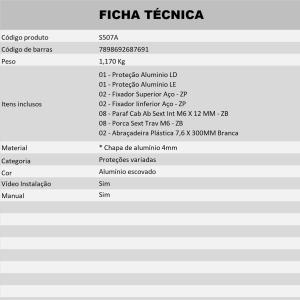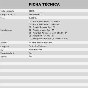 Produzida em aço carbono 3mm de espessura com acabamento em preto fosco ou prata epóxi e em chapa de alumínio 4mm com acabamentos em alumínio escovado e pintura epóxi preta, altamente resistente à impactos, bem como à corrosão.