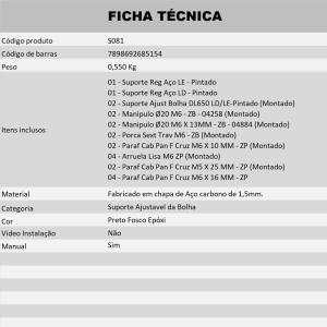 Feito em chapa de Aço carbono de 1,5mm de espessura com acabamento em preto fosco epoxi. Suas furações permitem ajustar o ângulo e a altura da bolha sem a necessidade de chaves, pois conta com manípulos que são facilmente acionados com as mãos.