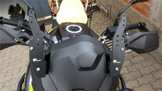Fabricado em chapa de aço carbono 3,75 mm de espessura com acabamento em preto fosco epoxi. Seu formato reto mantém o ângulo do suporte original da moto e suas furações permitem uma variação de altura de 7,4 cm até 12 cm, além das regulagens do suporte original.