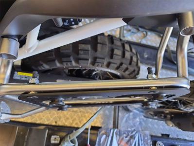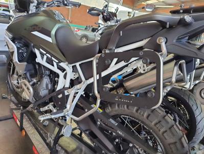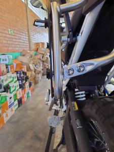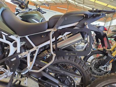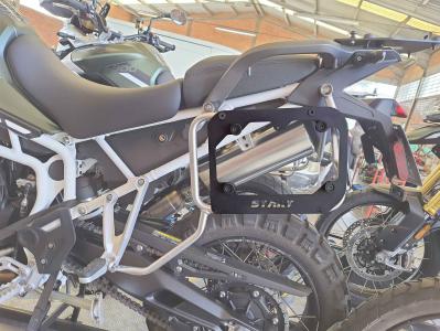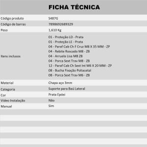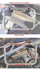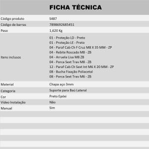Fabricado com chapas 3 mm e com acabamento em pintura epoxi preto fosco e prata epóxi. Fixado à moto pelo suporte de baú lateral original Triumph, não sendo necessário qualquer modificação nas características originais da moto.